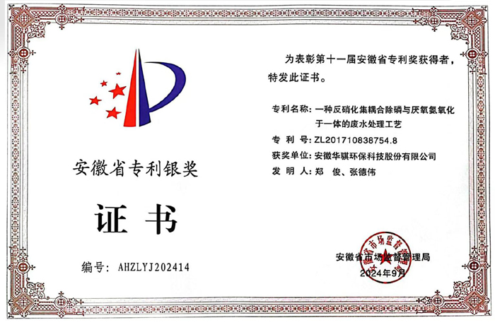 9月3日,安徽省市場監(jiān)督管理局(安徽省知識產(chǎn)權局)公示了第十一屆安徽省專利獎評選結(jié)果。華騏環(huán)保“一種反硝化集耦合除磷與厭氧氨氧化于一體的廢水處理工藝”發(fā)明專利榮獲安徽省專利銀獎。