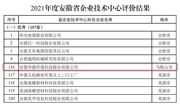 近日,安徽省經(jīng)濟(jì)和信息化廳發(fā)布《關(guān)于2021年度省企業(yè)技術(shù)中心評價結(jié)果的通知》,安徽華騏環(huán)??萍脊煞萦邢薰炯夹g(shù)中心獲評“安徽省優(yōu)秀企業(yè)技術(shù)中心”?!皟?yōu)秀”是省企業(yè)中心評價的最高榮譽,本次全省共計1538家企業(yè)技術(shù)中心,經(jīng)省經(jīng)濟(jì)和信息化主管部門審查、第三方評價與最終審定,其中157家省級企業(yè)技術(shù)中心評價為優(yōu)秀,753家為良好,537為合格,91家為不合格且撤銷省企業(yè)技術(shù)中心資格。獲評優(yōu)秀企業(yè)技術(shù)中心在產(chǎn)品創(chuàng)新、工藝創(chuàng)新、商業(yè)模式創(chuàng)新、產(chǎn)學(xué)研合作及創(chuàng)新成果等方面做出鮮明特色,并獲得優(yōu)異成果,對全省技術(shù)中心建設(shè)具有引領(lǐng)示范作用。