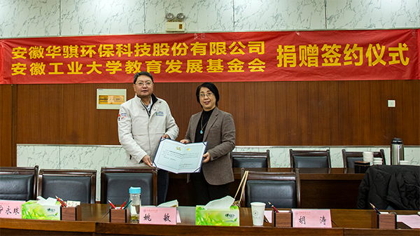 2022年1月14日,安徽華騏環保科技股份有限公司與安徽工業大學戰略合作簽約儀式在安徽工業大學會議中心舉行。華騏環保董事長王健,副總胡一強、費煜青,安工大副校長顧明言,校友處處長、教育發展基金會秘書長甘亞,體育部黨總支書記、主任胡濤,工會主席姚敏,學生工作部(處)處長何偉,團委書記王菁,校友工作處副處長、教育發展基金會副秘書長寧永球,體育部副主任程小坡出席了簽約儀式。體育部副主任李艷主持本次簽約儀式。此次簽約旨在為支持安徽工業大學教育事業的發展,支持安徽工業大學校園科技文化體育活動。