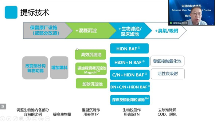針對污水廠提標改造面臨的難題,連宏偉介紹了華騏環保的系統解決方案: