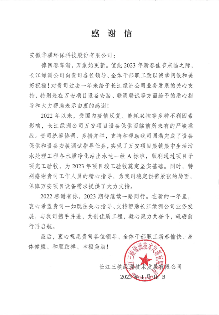 感謝信寫道:“2022 年以來,受國內(nèi)疫情反復(fù)、能耗雙控等多種不利因素影響,長江綠洲公司萬安項(xiàng)目設(shè)備保供面臨前所未有的嚴(yán)峻挑戰(zhàn)。華騏環(huán)保統(tǒng)籌協(xié)調(diào)、多措并舉,支持和幫助我司圓滿完成了設(shè)備保供和設(shè)備安裝調(diào)試指導(dǎo)任務(wù),實(shí)現(xiàn)了萬安項(xiàng)目集鎮(zhèn)集中生活污水處理工程各水質(zhì)凈化站出水達(dá)一級 A 標(biāo)準(zhǔn),順利通過項(xiàng)目子項(xiàng)完工驗(yàn)收,為 2023 年項(xiàng)目竣工驗(yàn)收奠定堅(jiān)實(shí)基礎(chǔ)。同時(shí),特別感謝貴司工作人員的精心指導(dǎo),為我司穩(wěn)定供需緊張的局面保障萬安項(xiàng)目設(shè)備需求提供了大力支持。”