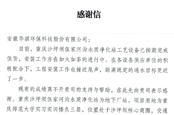 近日,長(zhǎng)江三峽綠洲技術(shù)發(fā)展有限公司向安徽華騏環(huán)保科技股份有限公司發(fā)來(lái)感謝信,對(duì)華騏環(huán)保工作人員在建設(shè)重慶沙坪壩伍家河溝水質(zhì)凈化站項(xiàng)目過(guò)程中,高效、有序的保障了項(xiàng)目…
